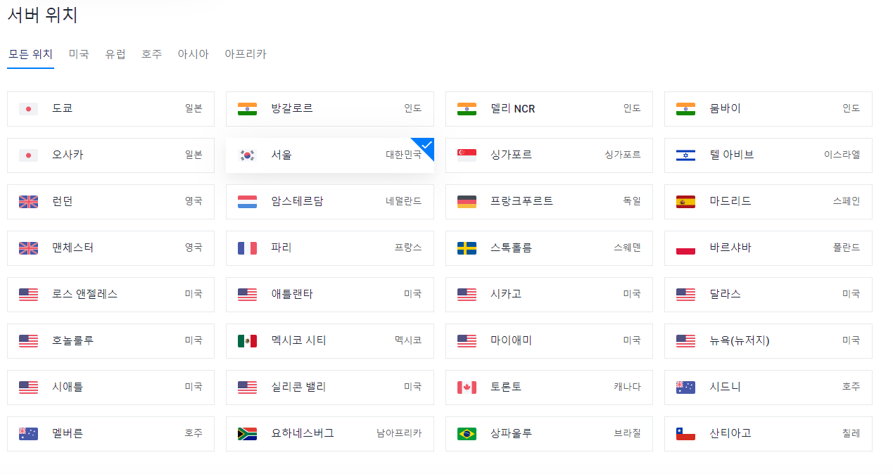 전 세계 여러 지역에 데이터 센터를 보유하고 있어 사용자의 위치에 가까운 서버를 선택할 수 있습니다. 이를 통해 더 빠른 속도와 낮은 지연 시간을 경험할 수 있습니다.